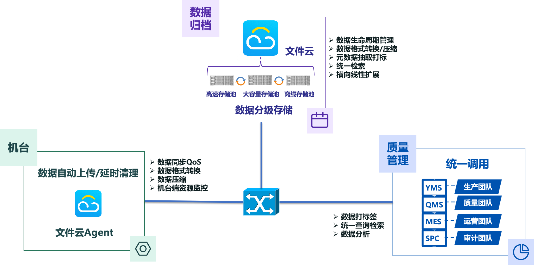 統一存儲管理多個廠區、產線的數據,支撐多機臺接入,實現應用和存儲的線性擴容,滿足數據長期保存的合規性要求
