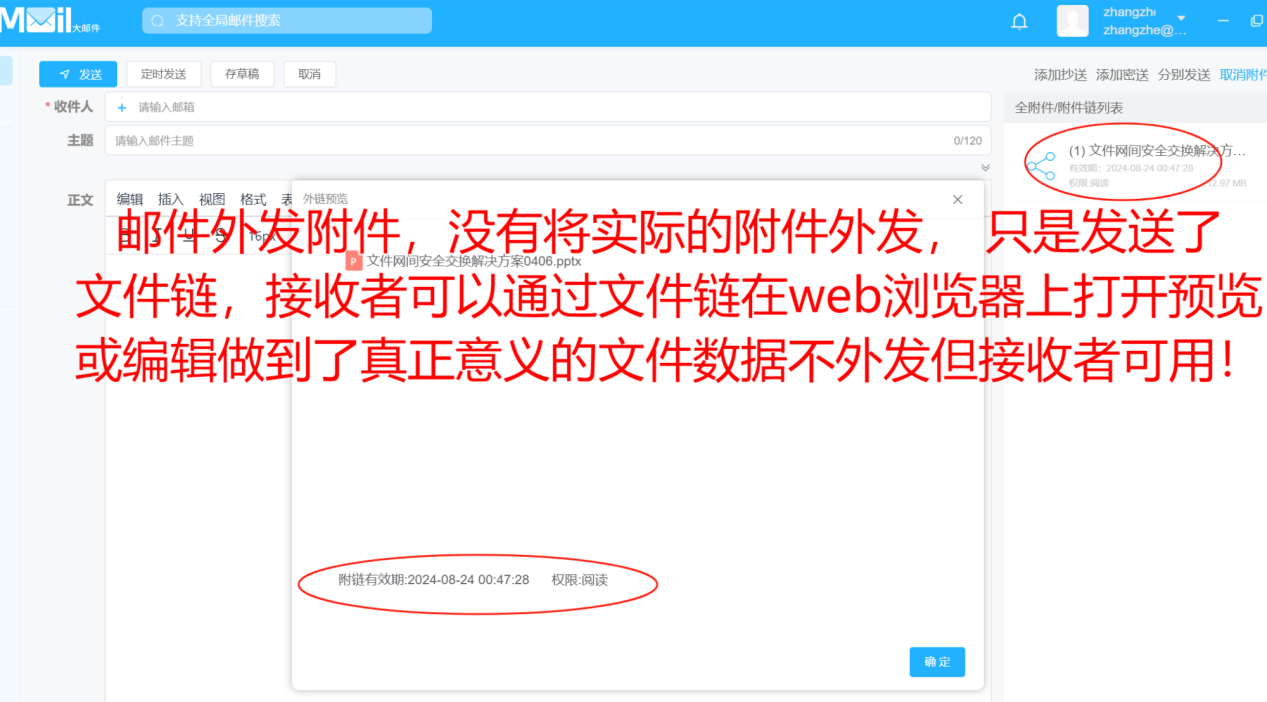 通過(guò)外鏈+WEB模式可以解決郵件、即時(shí)通訊、應(yīng)用系統(tǒng)文件泄露問(wèn)題。對(duì)于常見(jiàn)的辦公文件、CAD圖紙、各類(lèi)型圖片提供在線預(yù)覽或在線編輯能力,實(shí)現(xiàn)文件數(shù)據(jù)不落地。結(jié)合文件共享外鏈的能力, 就可以實(shí)現(xiàn)對(duì)于郵件外發(fā)文件、即時(shí)通訊上外發(fā)文件 都可以只發(fā)鏈接,但沒(méi)有發(fā)送實(shí)際的文件附件。外部用戶接收的都是只是一個(gè)文件鏈接,這些鏈接可以通過(guò)Web瀏覽器打開(kāi),進(jìn)行在線預(yù)覽、編輯回傳,但不可以另存在本地。